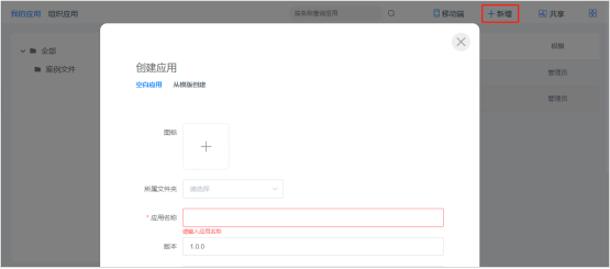 (1)空白应用 选择本次新增应用的“图标”、“所属文件夹”、“版本”、“应用名称”及“应用描述”后点击“创建”,即可创建一个空白应用。