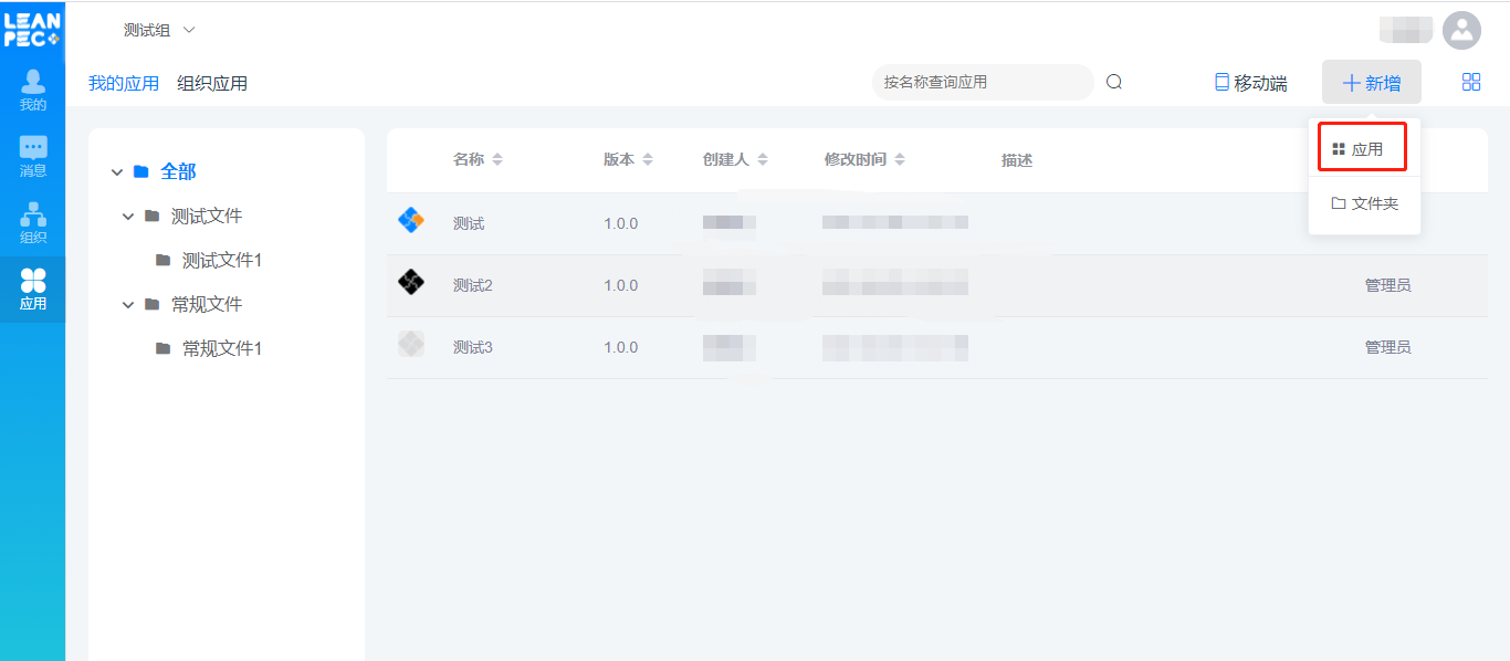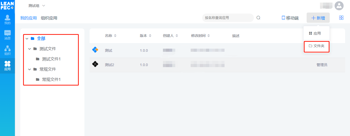 新增文件夹和应用1、新增文件夹在应用管理页面中点击右上角“新增”,出现下拉框选择文件夹,可弹出创建新文件夹的对话框,输入文件名称,可以选填上级文件,点击确认,文件夹新增成功,新增文件出现在左侧树形目录中。 注意:管理员可使用该功能