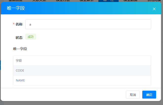 点击唯一性信息尾部的编辑“”按钮,会弹出唯一字段编辑页面。其中只能修改名称,唯一字段不能修改。