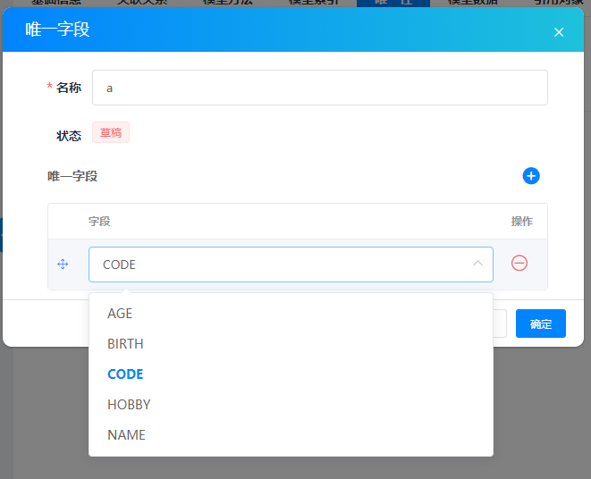 名称为必填,不可为空,点击按钮“”在下拉列表中选择需要建立唯一性的字段,可添加多个唯一字段,点击“确定”即可保存唯一性。