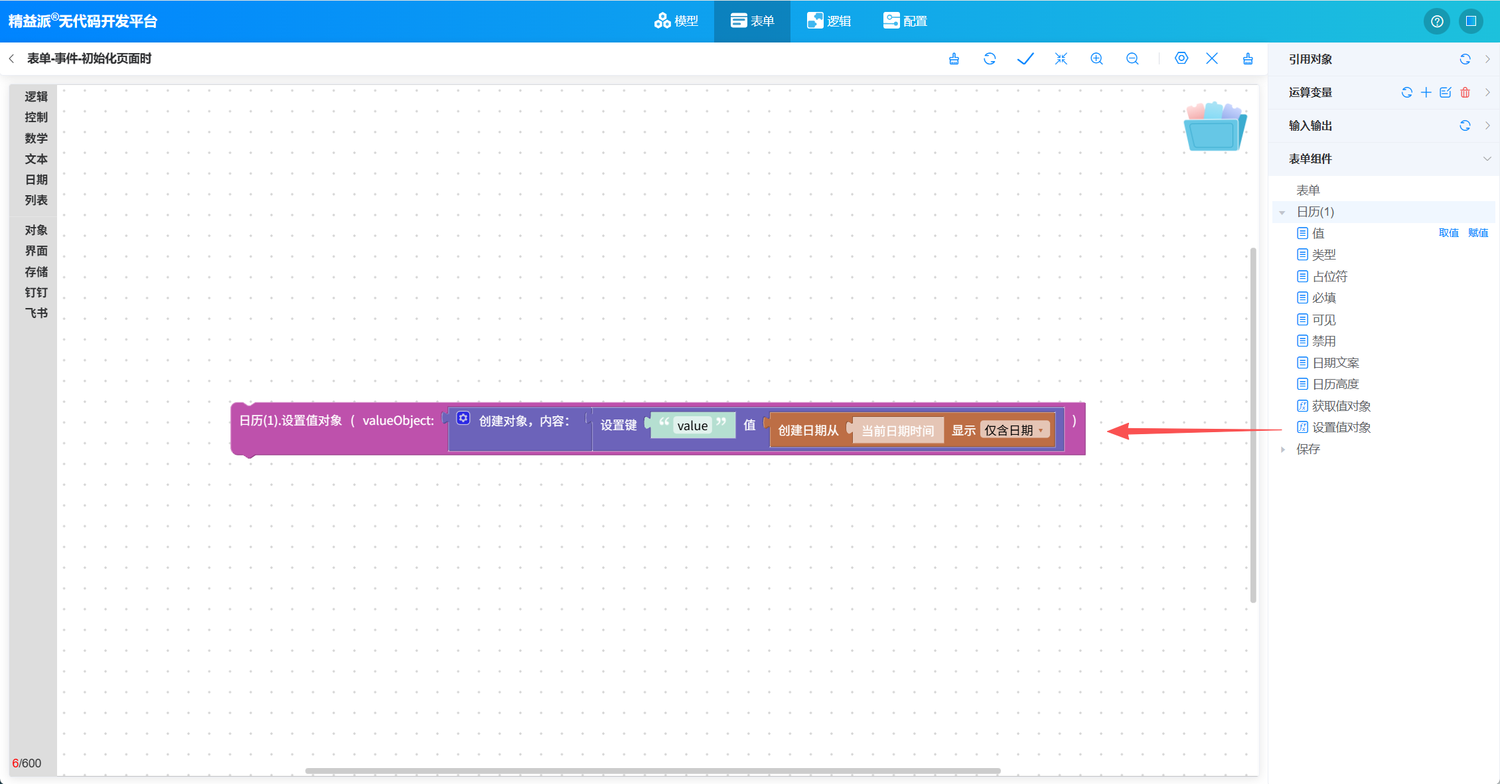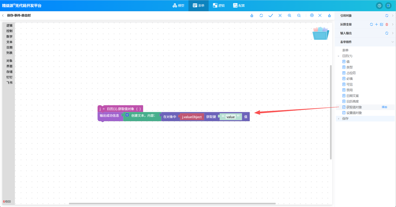 精益派2025-12-08更新功能更新 一.移动端-日历组件-增加取值/赋值方法。 1. 可通过该组件提供的“设置值对象”,“获取值对象”方法。设置或获取该组件选择的日期。 (1)设置值对象:需设置一个对象类型数据,对象中包含value键值对,value值即是所需设置的日期或者日期列表。 (2)获取值对象:方法返回一个对象数据,对象中包含value键值对,value值即是所需获取的日期或者日期列表 (3)组件类型:组件属性下,可设置不同使用方式,所对应的值类型也不同。 单个时间:取值或赋值的是单个日期 多个时间:取值或赋值的是日期列表 日期区间:取值或赋值的是日期列表(列表中需包含开始日期和结束日期,按时间排序)
